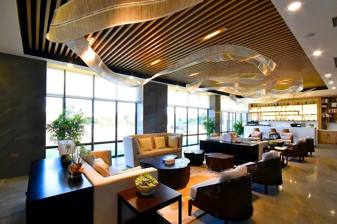 整座酒店佔地面積達1.8萬m²,主樓高5層,外觀裝飾宏偉大方,內部裝飾流金溢彩,庭院怡人雅靜。