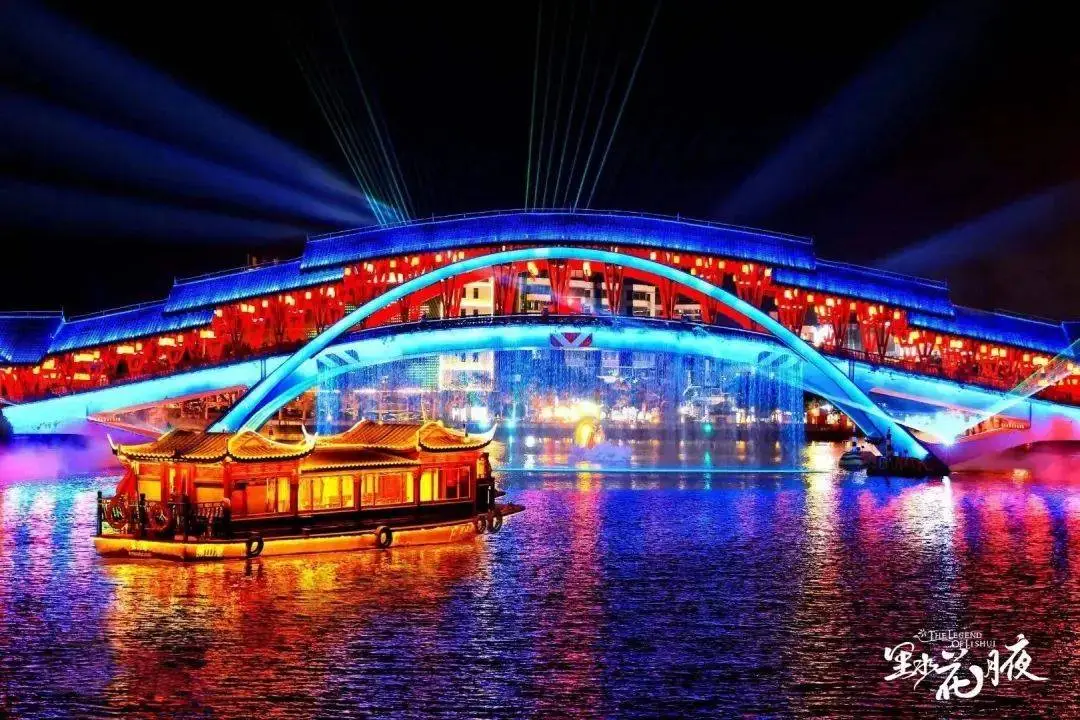 『花月夜遊船』:乘船夜遊水鄉,拂過晚風溫柔,在裏水煙波裏輕輕搖曳。沿岸的光影與真人演繹,交相輝映,娓娓道來,仿佛置身花月幻境。