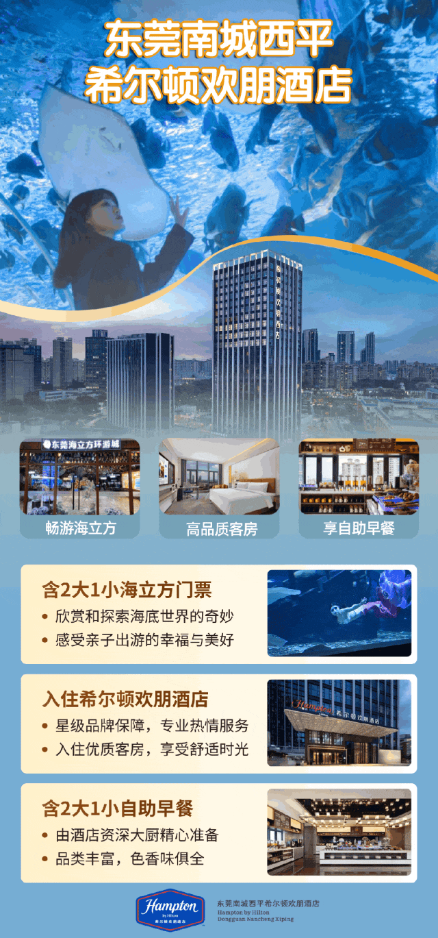 東莞南城西平希爾頓歡朋酒店與東莞海立方環遊城攜手帶來超值親子“玩住”套餐:高級房1晚+2大1小海立方門票+2大1小自助早餐。