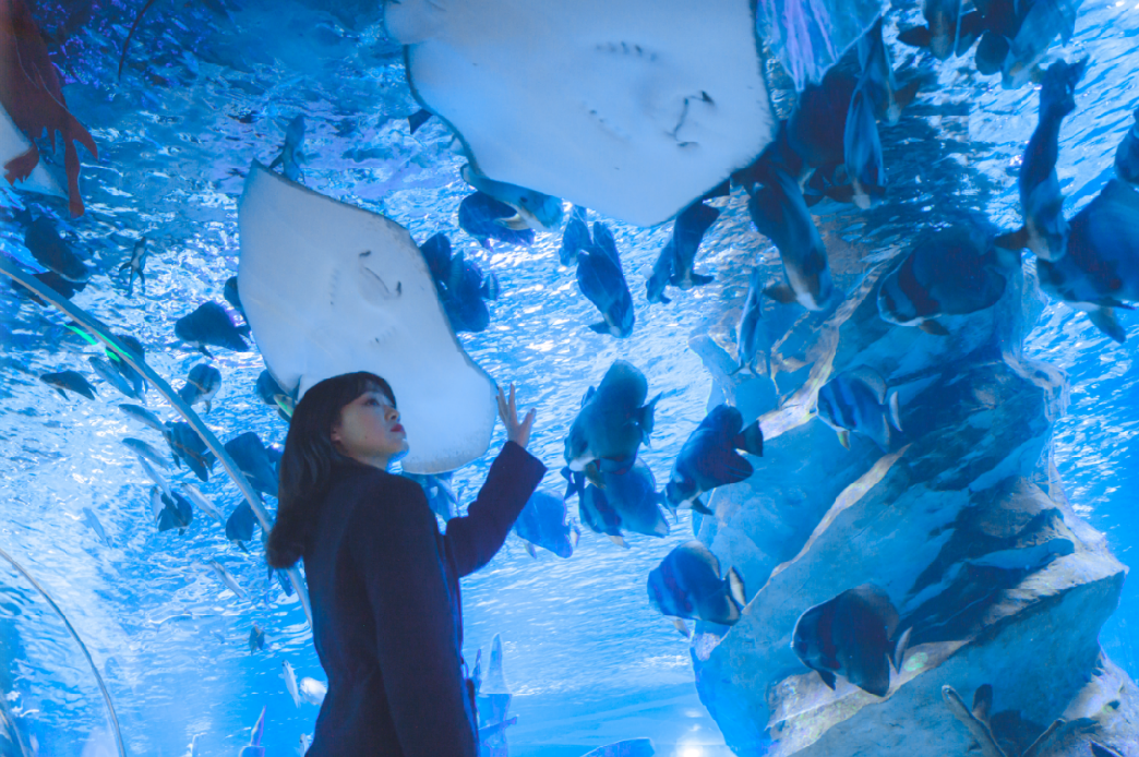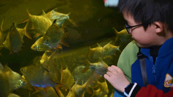 來到歷奇部落,超大透亮觀景窗在前,成千上萬條魚在身邊遊:五彩熱帶魚群像流動彩虹唰過,扁扁“笑臉魚”鰩魚撲扇“翅膀”打招呼;活生生海洋世界在眼前,海洋明星全有,近距離看它們吃飯玩耍萌翻!