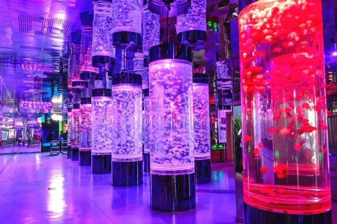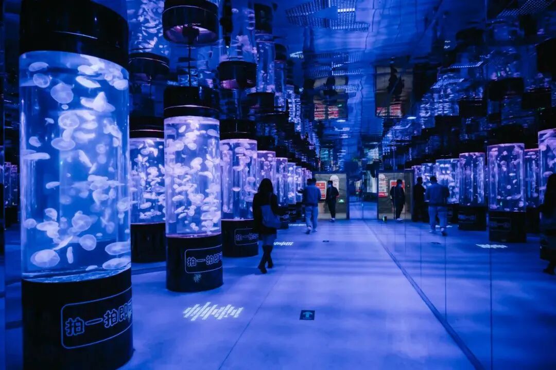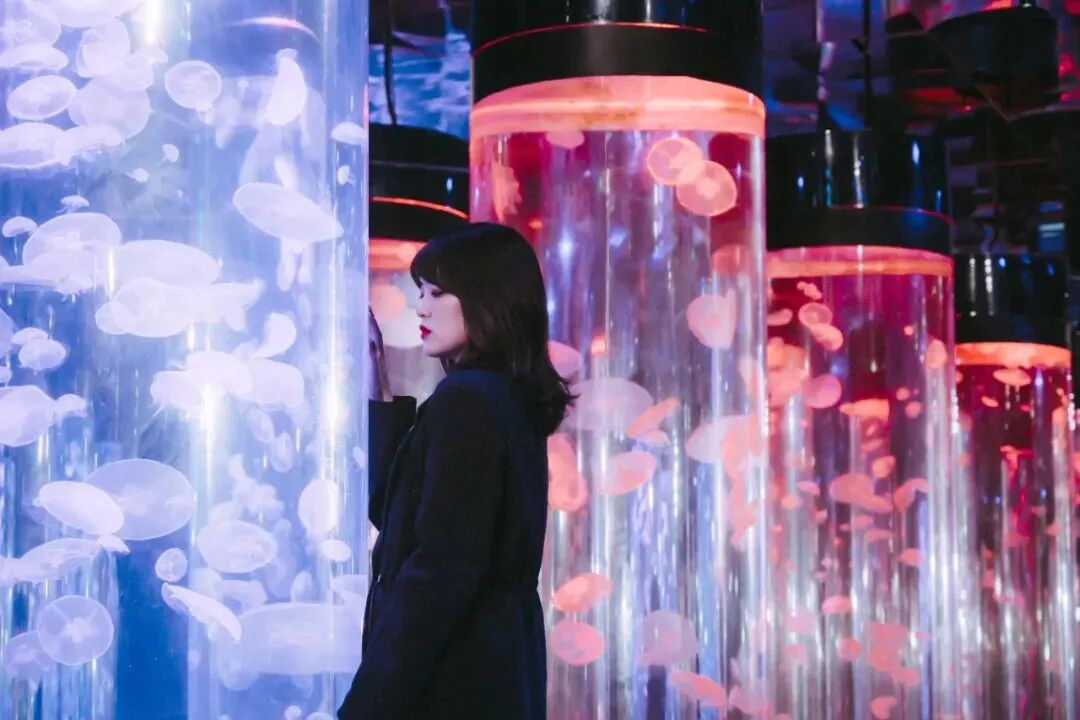 走進唯美的水母宮像掉夢幻星球:發光“水晶柱”裏住滿水中小精靈,一開一合一飄一蕩像透明果凍、會遊泳小傘;不同燈光打在身上絕美,站柱中間被溫柔光和海洋包圍!