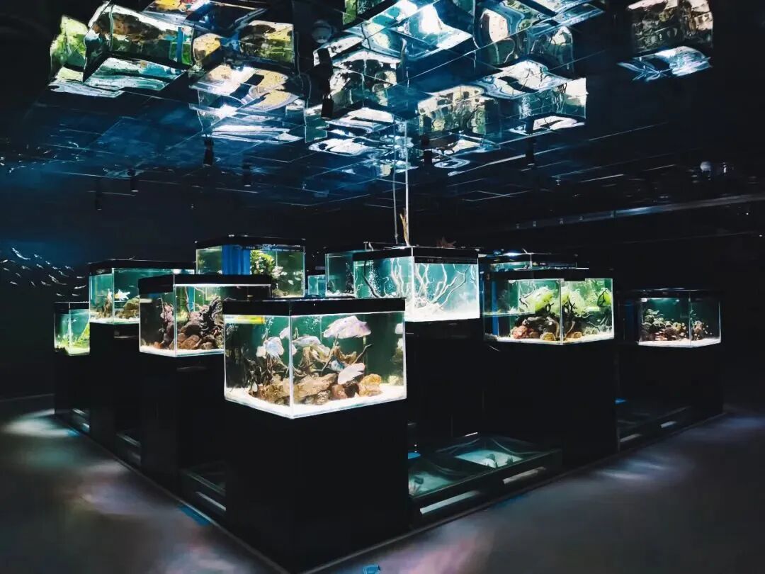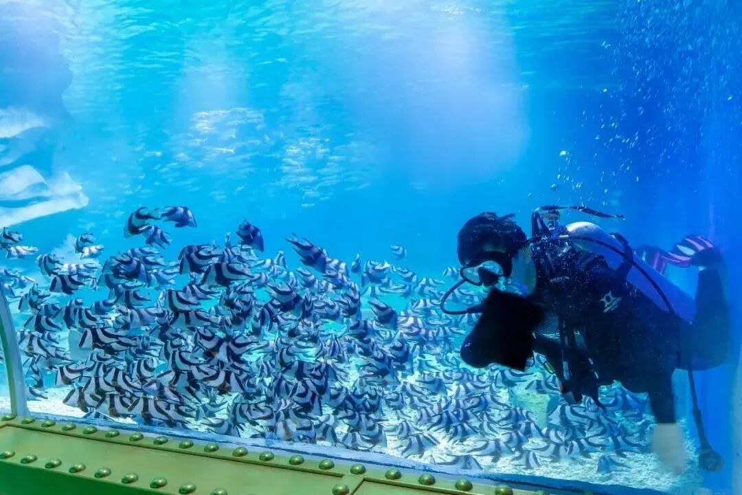 一腳踏進未來海洋夢幻藍洞:180度被魚群包圍超震撼超好拍,像科幻片潛水;幽藍光影吞沒半個圓頂,上下左右全是遊動的魚,成千上萬條穿梭眼前身邊頭頂;是流動藍色夢境,藍光籠罩魚群像深空星辰劃過,水波光影搖曳每一步像深海漂浮!