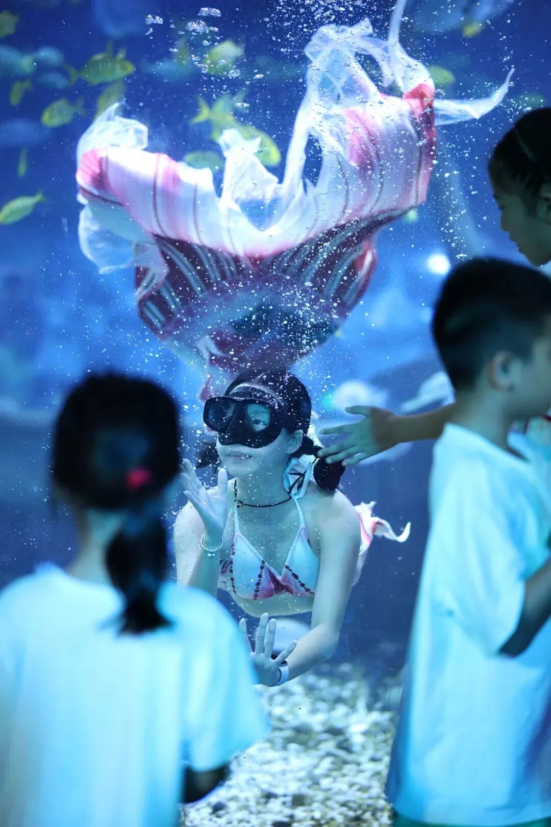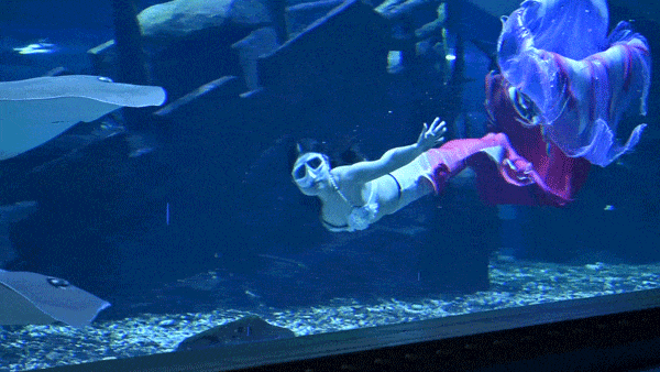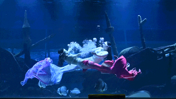 看!水裏遊來超美“美人魚”——小姐姐穿魚尾裙跳絕舞,身姿柔韌輕盈,閃亮魚尾劃漂亮弧線,泡泡打轉;轉身伸展優雅靈動,天生屬水,水是舞臺光為追燈,不用去深海即可見證夢幻之舞!