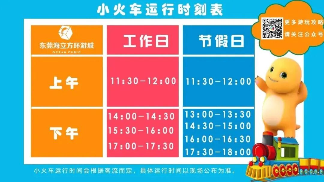 以下是東莞海立方環遊城的小火車運行時間表: