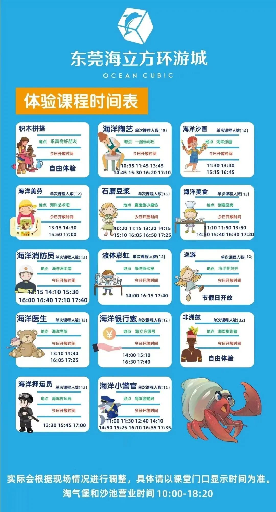 以下是東莞海立方環遊城的體驗課程時間表: