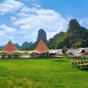 系崇左新和鎮四星園林式度假酒店,依山靠水,東南亞風格大堂配觀湖景吧;房間用原木設...