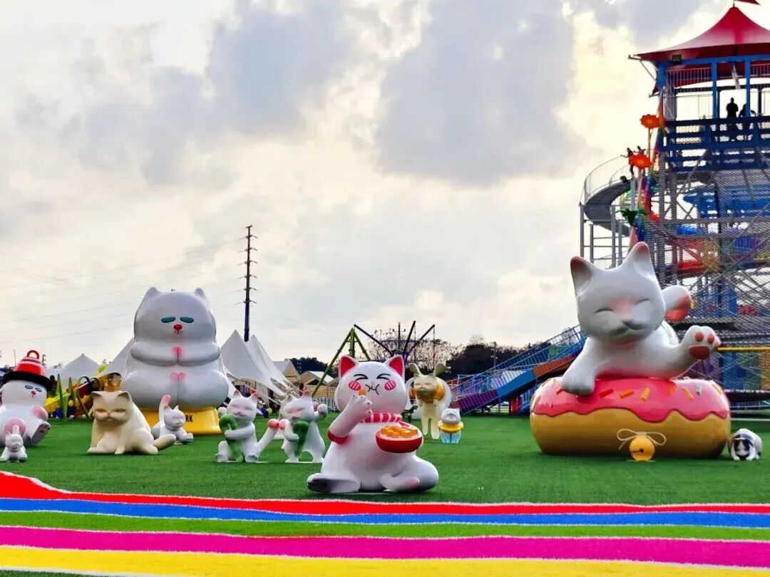 位於百裏芳華倫教段良仁湧水閘附近由閑置地塊改造提升而成公園佔地面積約20000平方米整體設計色彩繽紛多個可愛貓咪造型立於園區內充滿童趣