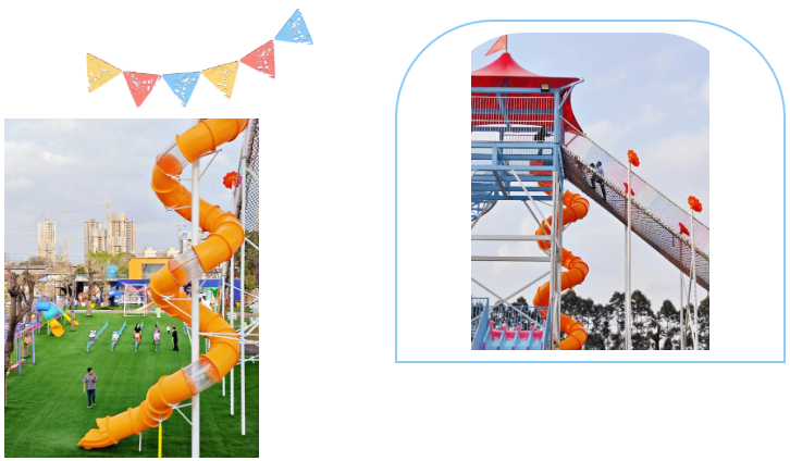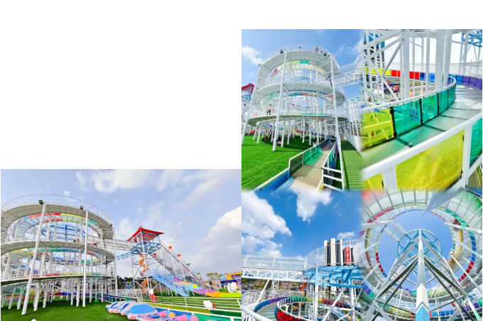 和勇攀高峰連為一體的是海陸空旋轉玻璃滑道這一項目考驗體能得先自己拉著小皮艇走到頂部方能坐著皮艇在七彩玻璃滑道從高處一滑而下主打一個絲滑和刺激ps:雖然拉皮艇挺累的,但過程中從高處眺望遠處的風景,也是別有一番滋味哦。