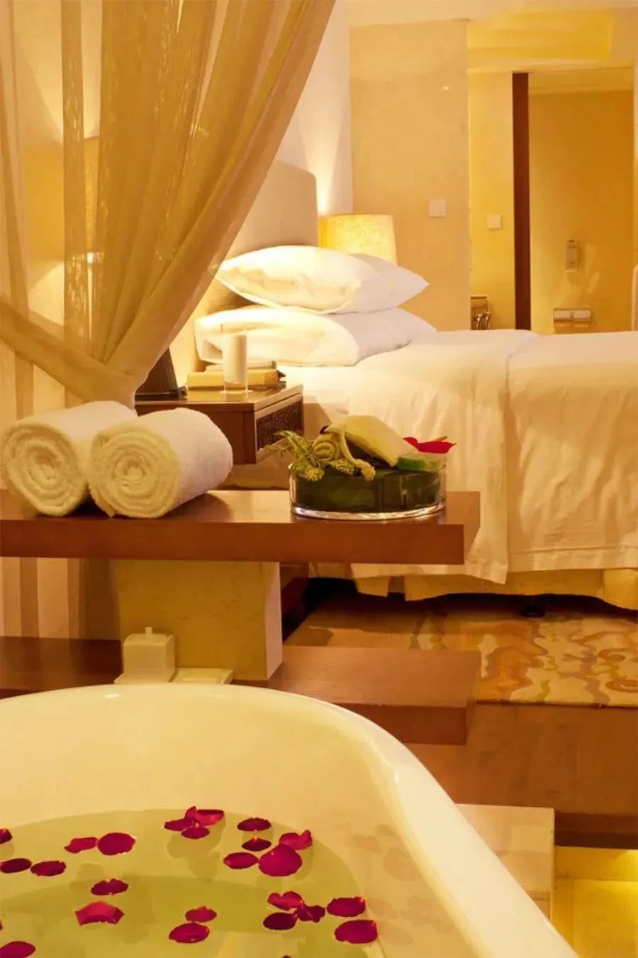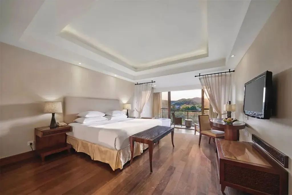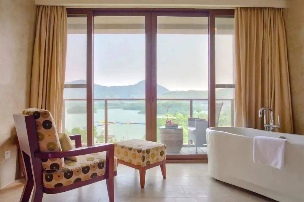 ▲湖景房陽臺房間內的設計也非常雅致,大大的落地窗采光充足,臨窗而立,紗簾拉起、音樂放響,盡情享受這靜謐的溫馨時光。