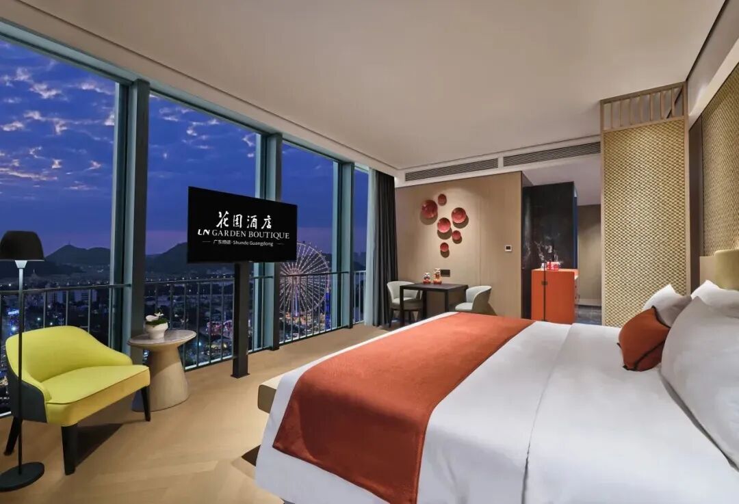 酒店采用了創新的分層大堂設計,在酒店17樓高空采用建築外挑懸空結構設置景觀大堂,酒店建築結構以突出方塊轉動、畫框交疊,挑空高空大堂、高空餐廳呈現亮點,隔窗俯瞰順德過去、現在、未來,跨越時代的樓宇風格不同美感盡收眼底,提供真正的城市度假體驗