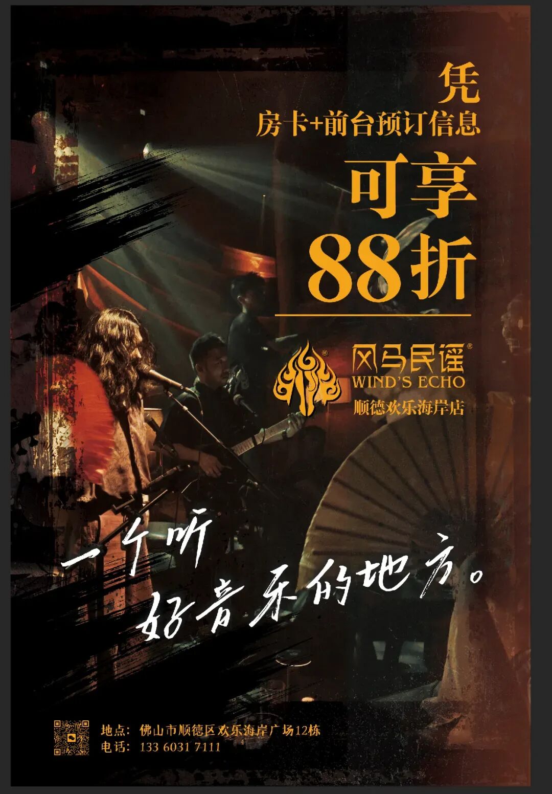 酒店晚上特惠活動瘋玩一天累了,可以去風馬民謠聽聽歌曲憑房卡 前臺預定信息可享受88折優
