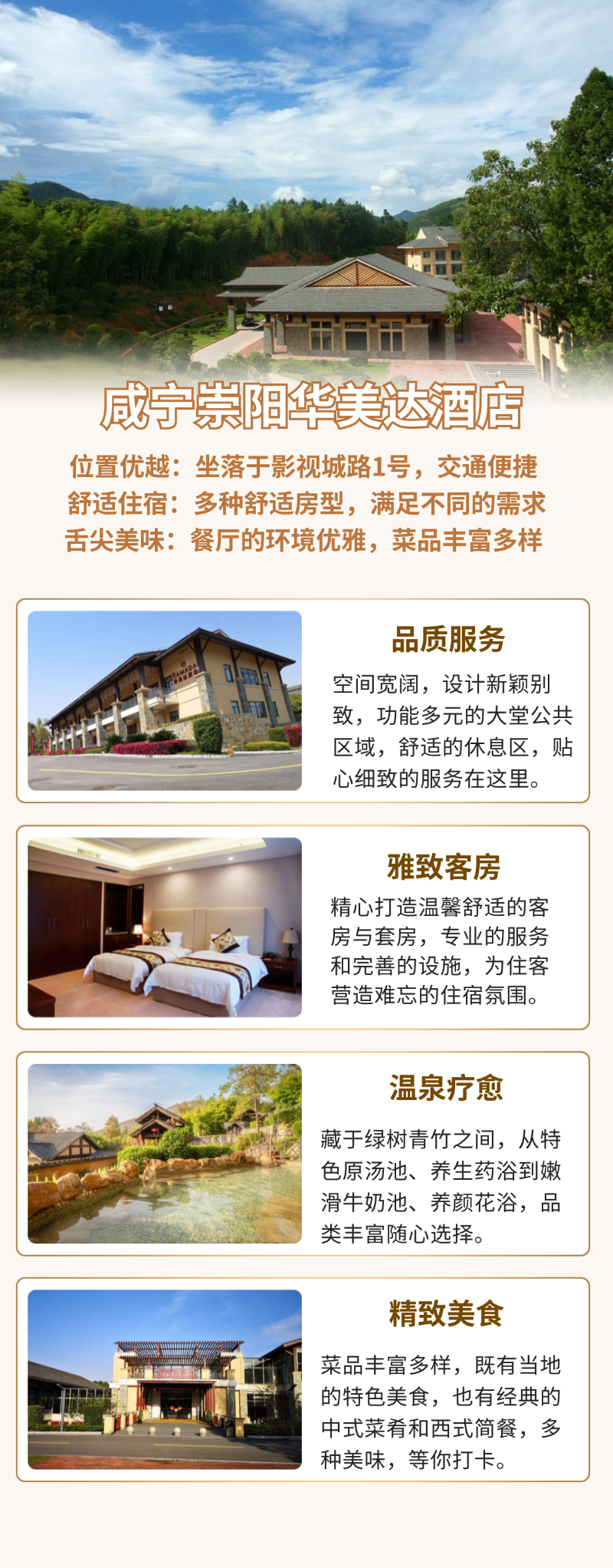 酒店坐落於影視城路1號,緊鄰縣政府與崇陽大道,驅車10分鐘可達崇陽浪口森林溫泉、葛仙山等核心景區,更與壺頭峽漂流、三特浪口溫泉形成“1小時微度假圈”。