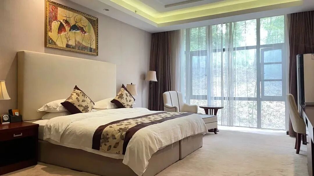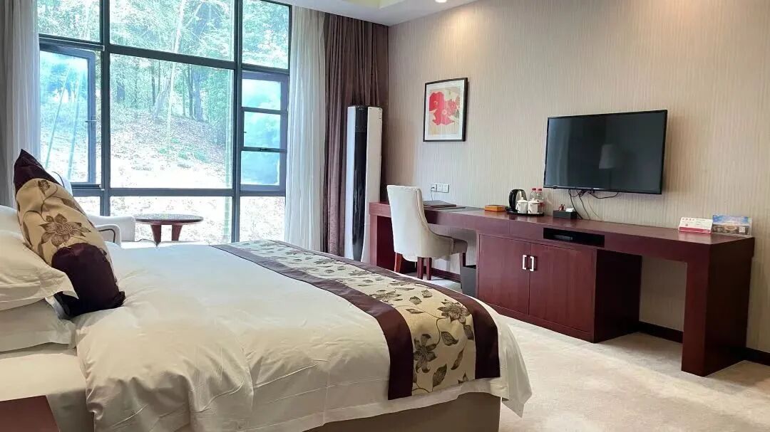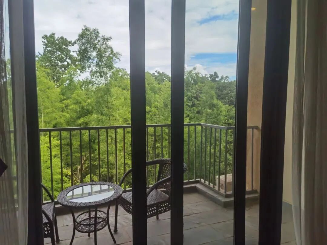 和車友自駕來崇陽,選這家因為免費停車,含溫泉票超劃算!房間40多平,落地大窗看竹海...