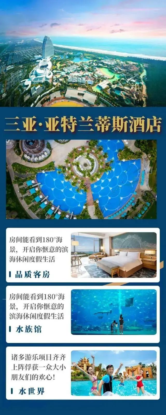 三亞亞特蘭蒂斯以傳說中失落的亞特蘭蒂斯城邦為藍本雄踞海棠灣國家海岸,俯瞰迷人的中國南海之濱而且匯集度假酒店、水世界、水族館、餐飲、娛樂購物、演藝、國際會展八大豐富業態於一體如此美麗的度假勝地,現在不去更待何時