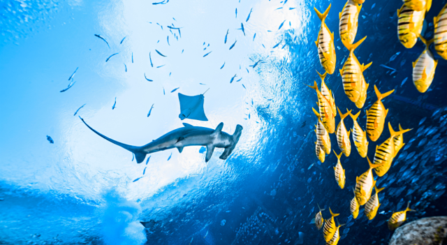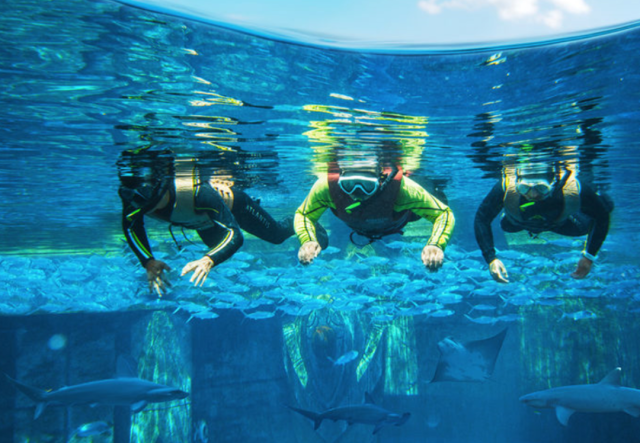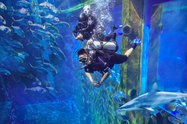 -潛水探索之旅- 在失落的空間水族館內的大使環礁湖裏開啟潛水探索之旅與鯊魚、鰩魚和其它色彩斑斕的海洋生物親密接觸為奧妙多姿的海中奇境所震撼著迷
