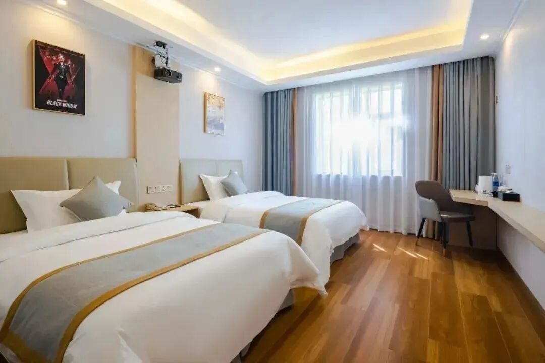 投影雙床房柔軟舒適的雙床、柔和美麗的燈光用心放置的裝飾、齊全的基礎設施為你創造了一個優質的居住環境