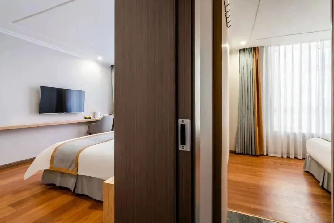 闊幕雙床房床鋪柔軟幹凈,暖黃色的燈光十分溫馨舒適的床品擺設,伴您整晚安然入睡