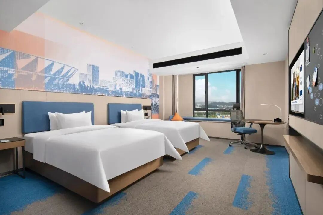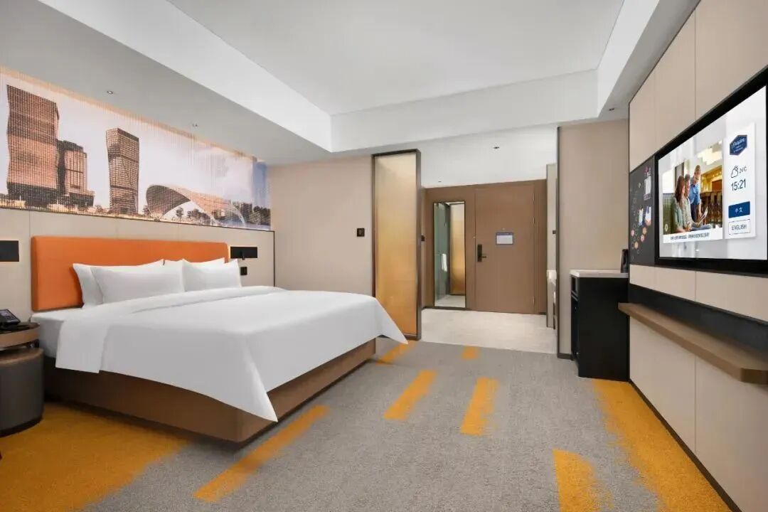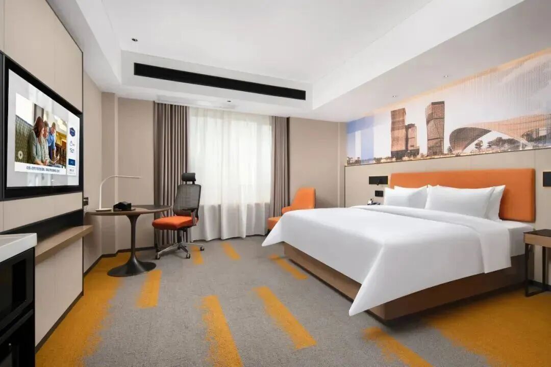客房淺暖色調的現代設計風格,巧妙的空間布局,為您帶來溫馨舒適的體驗。美國“Hampton Bed®”標準Serta雙專利床墊,另配生態認證的床上用品,打造雲端甜夢體驗。
