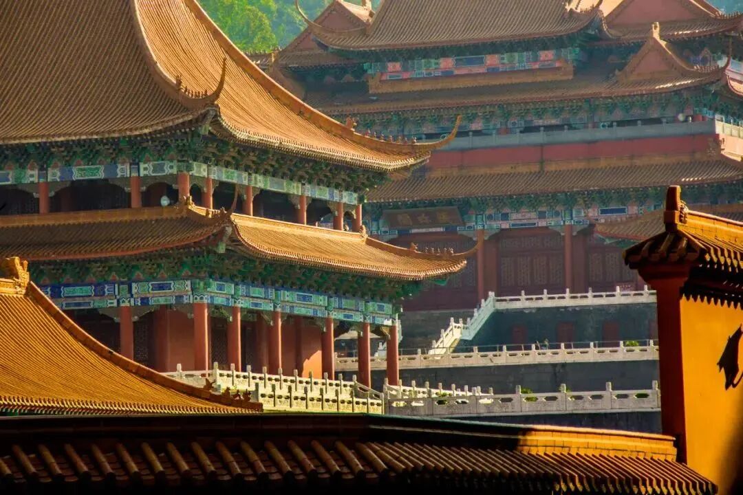 (一)皇宮區金碧輝煌的宮殿群建築以中軸線對稱興建,主要建築包括城墻、城門樓、五龍橋、真神聖天門、榮光大殿、藏珍閣、後林苑。皇宮區宏偉的規模、恢弘的氣勢、深厚的內涵,豪邁之氣油然而生,凝望著歷史的瞬間,恍如隔世又近在眼前。