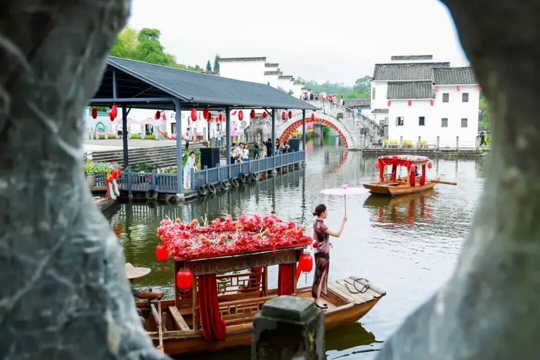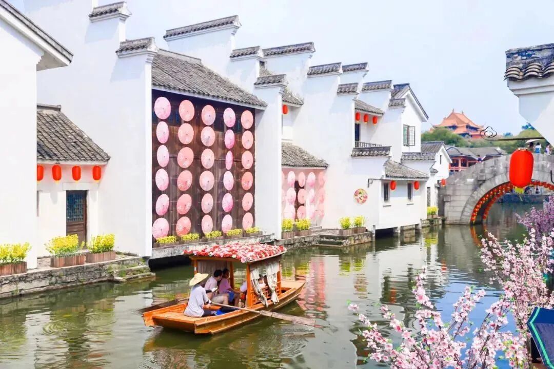 (二)江南水鄉區青磚黛瓦的江南水鄉薈萃了徽派和浙派建築的精髓,主要建築包括金陵商埠、國學府、鐘鼓樓、蘇州街以及各色特色江南小景,置身其間,領略小橋流水的江南雅韻,還可體會淳樸的民風民俗。走近江南水鄉區,一同尋覓“紅豆相思樹”,打卡愛情福地;參觀傳統非遺文化館,品味百年工藝匠心。