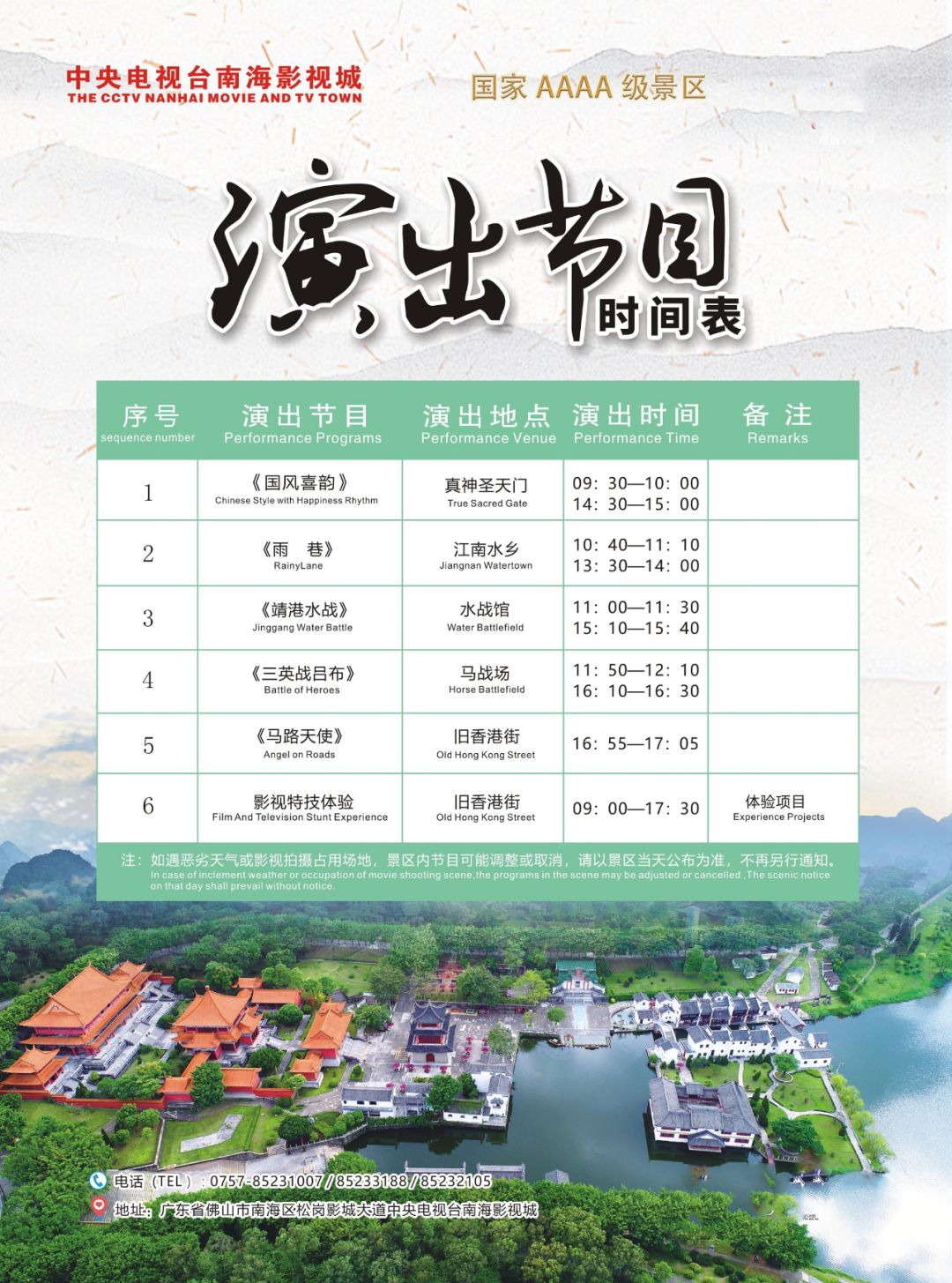 (五)節目表演區景區每天各個時段都精心安排了不同的節目表演,包括驚險刺激的《三英戰呂布》、詼諧滑稽的《靖港水戰》、傾力新編的《國風喜韻》、浪漫柔情的《雨巷》以及獨具風韻的《馬路天使》;在南海影視城令你猶如進入時光機器,一時回到古代皇朝故宮,一會來到現代繁華都市,整趟旅程妙趣橫生。