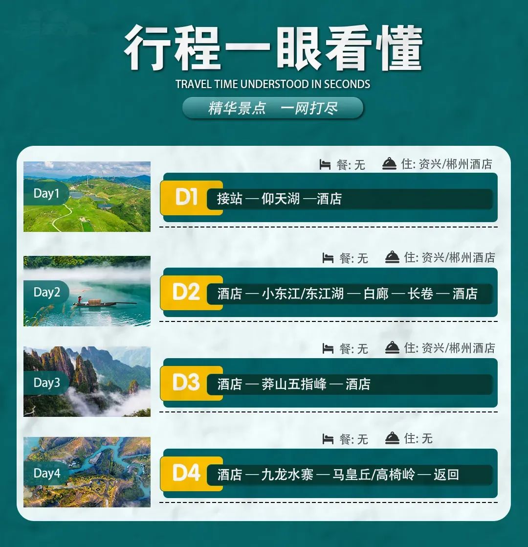 16:00 根據列車時間,送至火車站或高鐵站乘坐列車返回(車程約1小時)各位貴賓各自返回溫馨家中,結束此次愉快行程!建議購買下午17-18點的高鐵票或火車票。此次旅遊總共跨越4天時間,以上行程領隊會根據實際情況作相應調整,但總行程不變。仰天湖每年只開放4-11月,閉園的時候改回龍山價格不變。