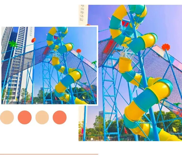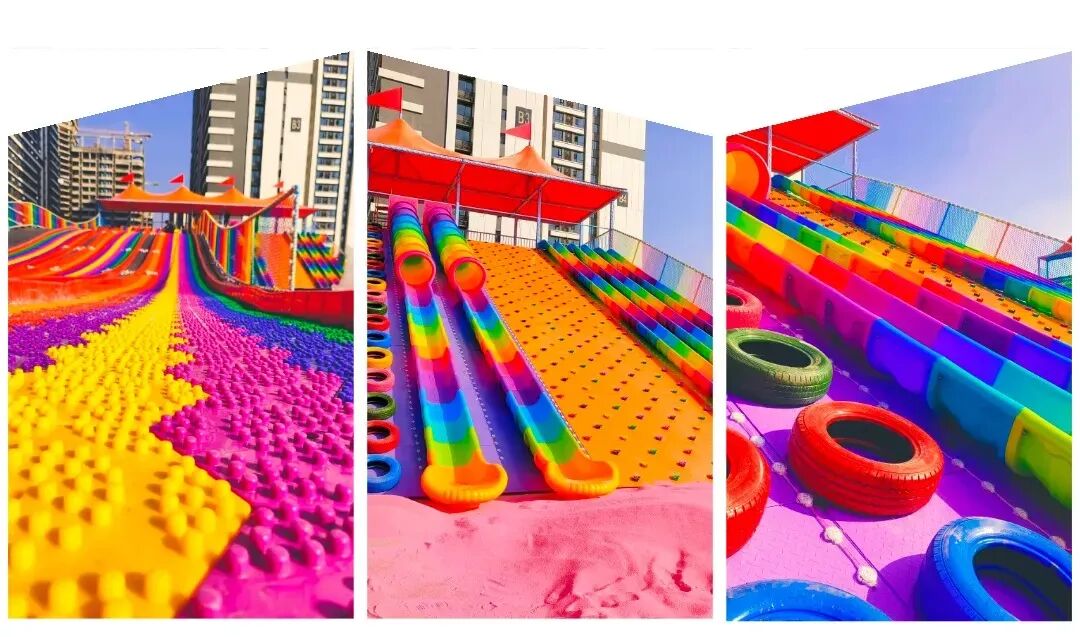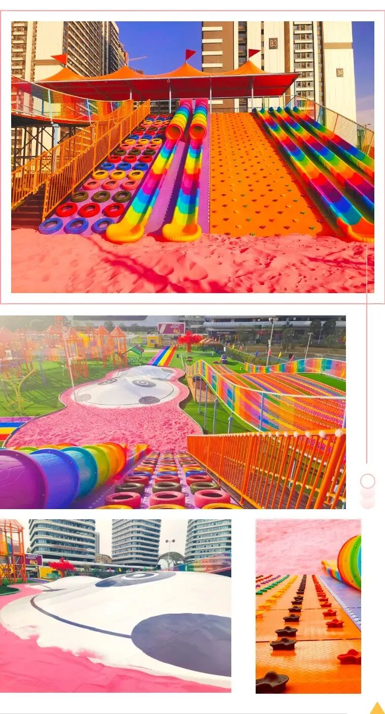 多種組合大型滑世界,又高又大又多彩挑戰七彩輪胎和攀巖石6個桶滑道逐個嘗試還有3條絢麗奪目的超長彩虹滑道從“雲端”出發,呼嘯而下感受速度的激情