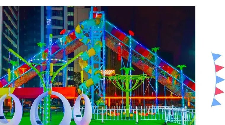孩子們自我挑戰沿着繽紛的繩網攀爬上10米的高台順着七彩的螺旋滑梯旋轉滑下,快樂buff~