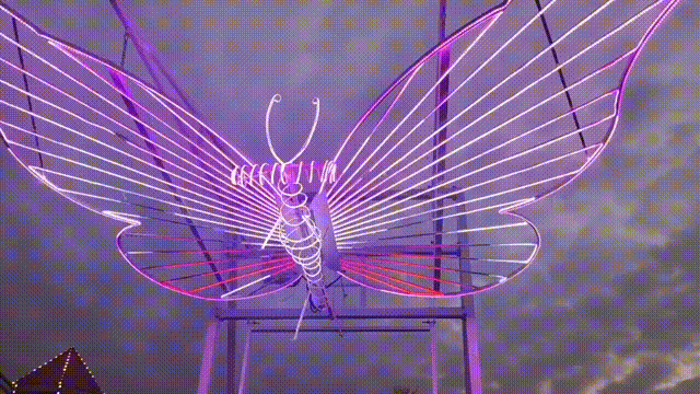 漂浮在空中巨型蝴蝶晚上流光溢彩在發光蝴蝶下坐着鞦韆乘風愜意飄蕩,自在逍遙