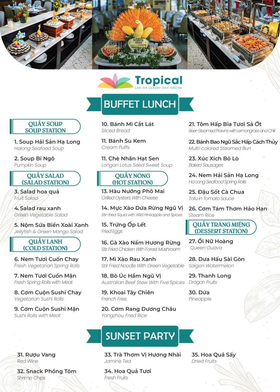 「獨特」之旅 – 下龍灣、蘭哈灣與吉婆島一日遊 – 5 星級遊輪 7 小時 – TROPICAL CRUISE 這不只是一趟觀光行程,更是一場沉浸於大自然的奢華之旅。您將在優雅的遊輪上盡享極致放鬆,並結合精彩活動與難忘體驗,探索下龍灣、蘭哈灣與吉婆島的絕美風光。 這不僅僅是一次旅行,更是一趟為追求與眾不同體驗的您量身打造的頂級航程。