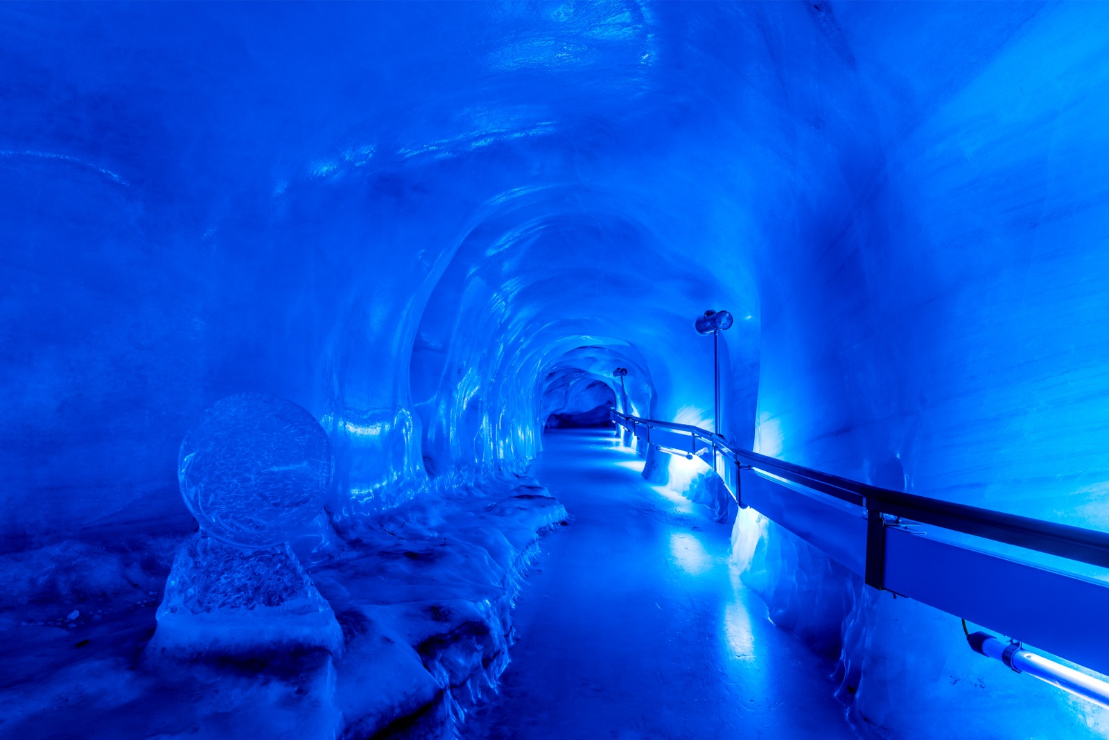 抵達山頂後,可挑戰鐵力士 Cliff Walk 懸索橋,這是歐洲最高的懸索橋,走在懸空步道上,一邊是雄偉山壁,一邊是深不見底的山谷,驚險又刺激,同時能將阿爾卑斯山全景盡收眼底。接著前往奇幻的冰川洞穴,走進純淨冰藍色的冰河世界,近距離感受千年冰川的清涼與神祕,體驗宛如童話般的冰雪空間。