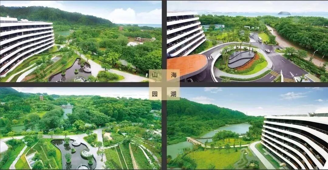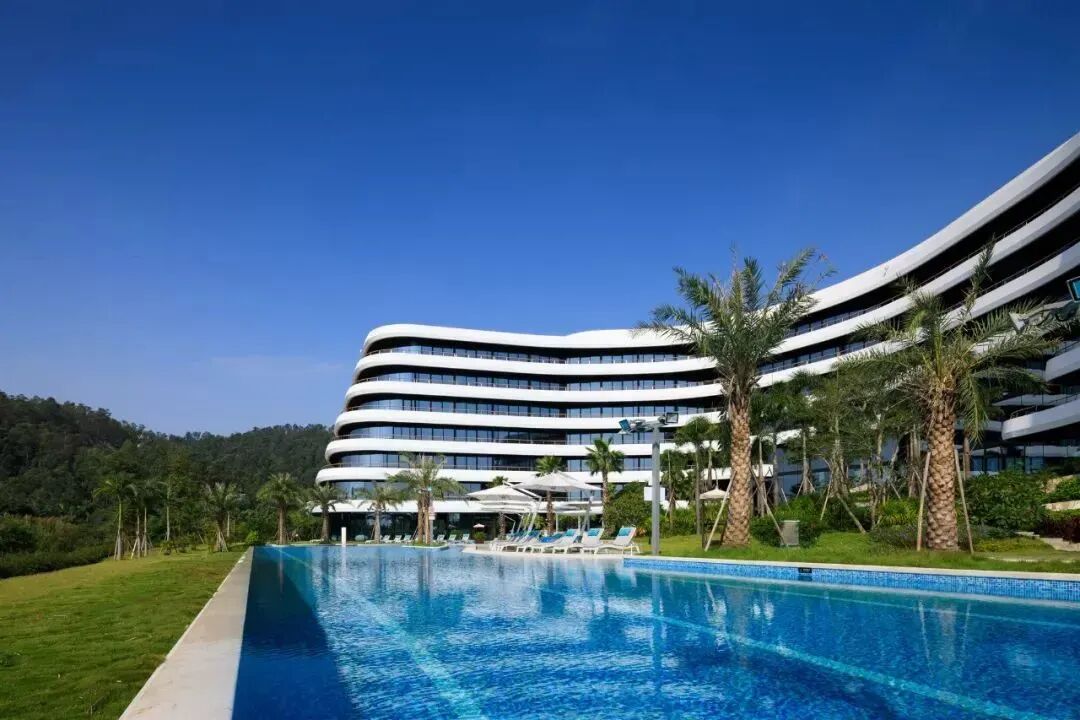蝶形設計的建築如一座花園城堡面朝“山、海、湖、園”不同景觀帶給每個房間近180度的視覺觀賞體驗!如東邊是“四季繁花”的無國界園林西邊有“親水遊憩”無邊際泳池與湖景景色……近看又似一艘行駛在綠植組成的浪濤上的豪華郵輪線條靈動、飄逸、大氣!