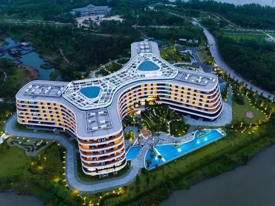 酒店的外形從空中俯視猶如一隻暢遊在森林間的巨型蝴蝶蝶形建築外型還創現代酒店設計的先河結合四周“山、海、湖、園”的景觀將伶仃洋西岸和葱鬱森林的醉人風光盡收於此