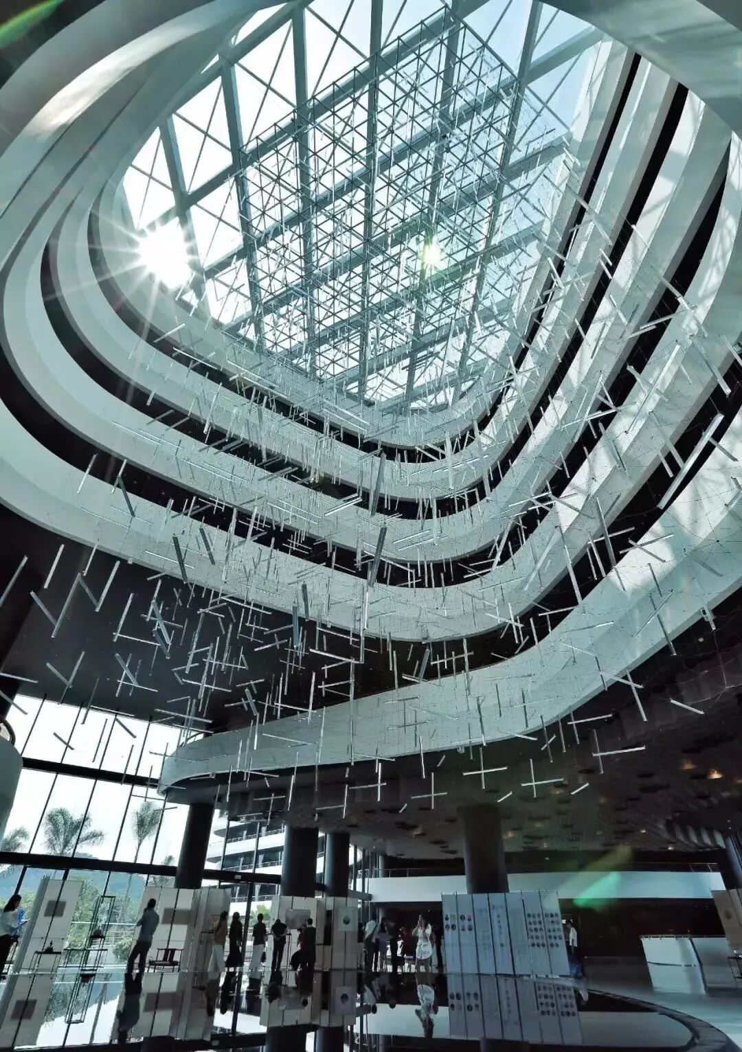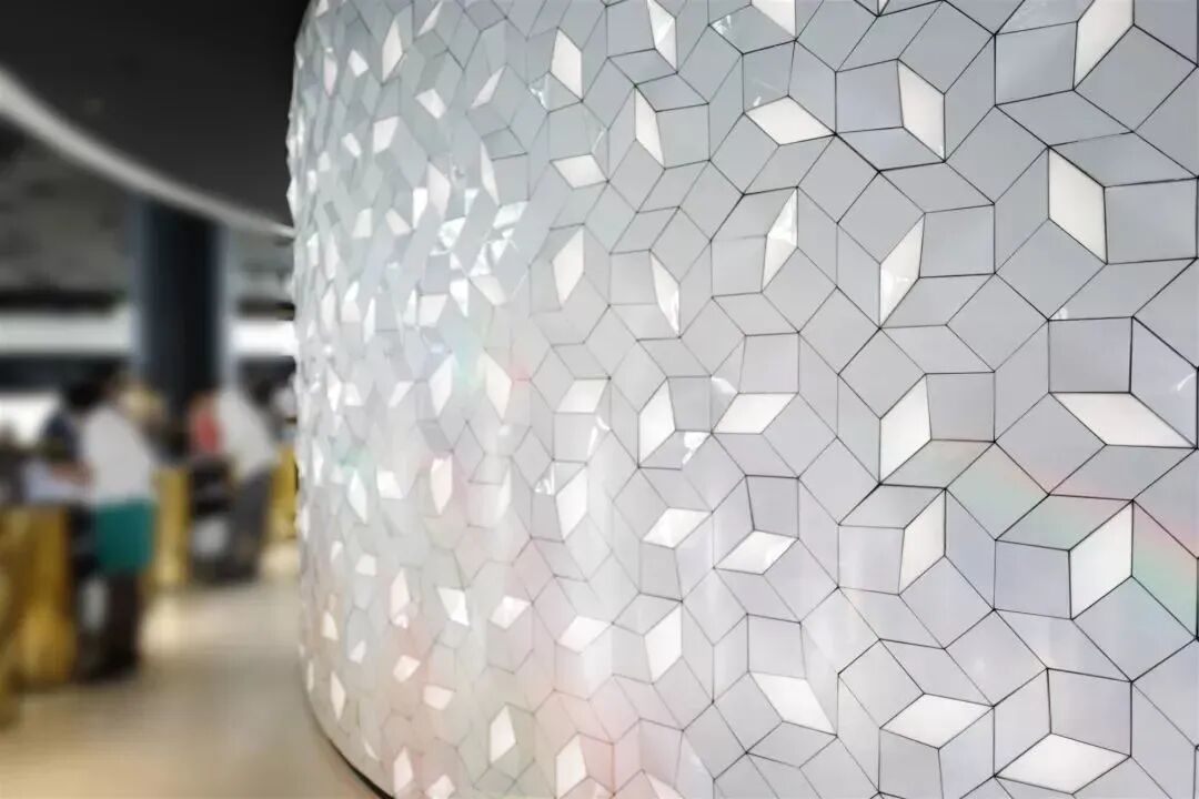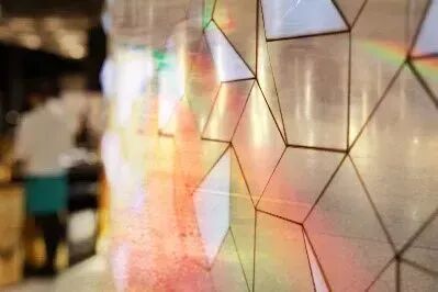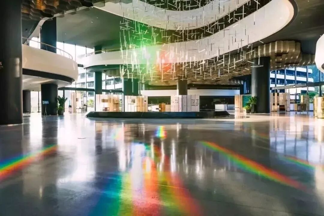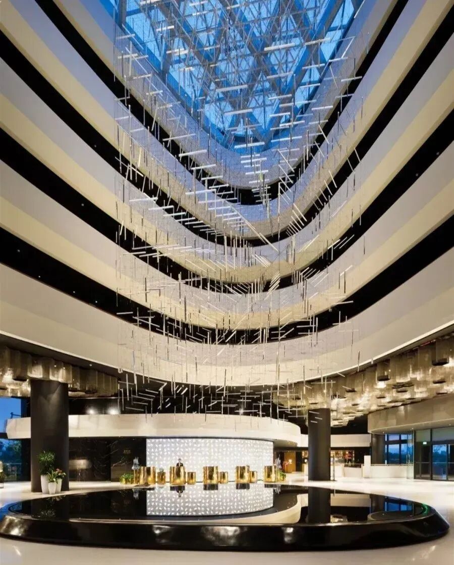 一走進酒店大堂就像穿越到光影流動的藝術時光隧道頂部懸掛的亞克力吊飾如從天際掉落的星辰這個聽起來很浪漫的“光影回聲”