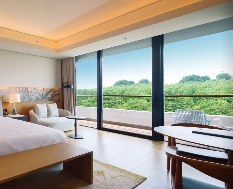 入住55㎡起跳超大陽台酒店客房 面積55㎡起跳的園林景觀客房超大露台搭配全景落地窗躺在牀上即可將南沙美景看個遍!