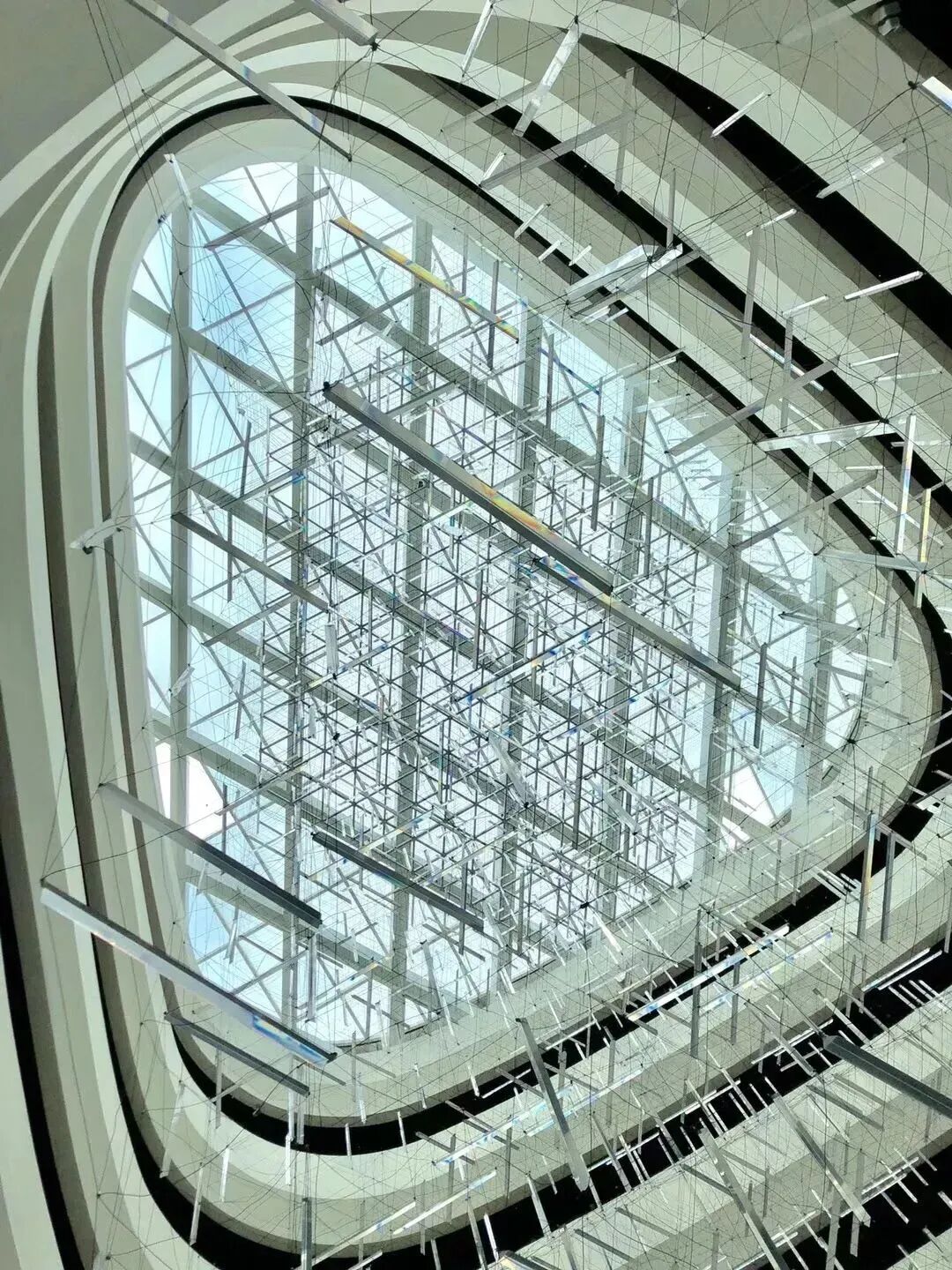 由德國藝術家打造,你能通過它感受1618根精心設計的透明稜柱由大堂中庭從天而降通過堂頂射入的自然光線折射出神秘彩虹光暈8分鐘之前的太陽光的回聲就好像它帶着光線從太陽旅行到了地球