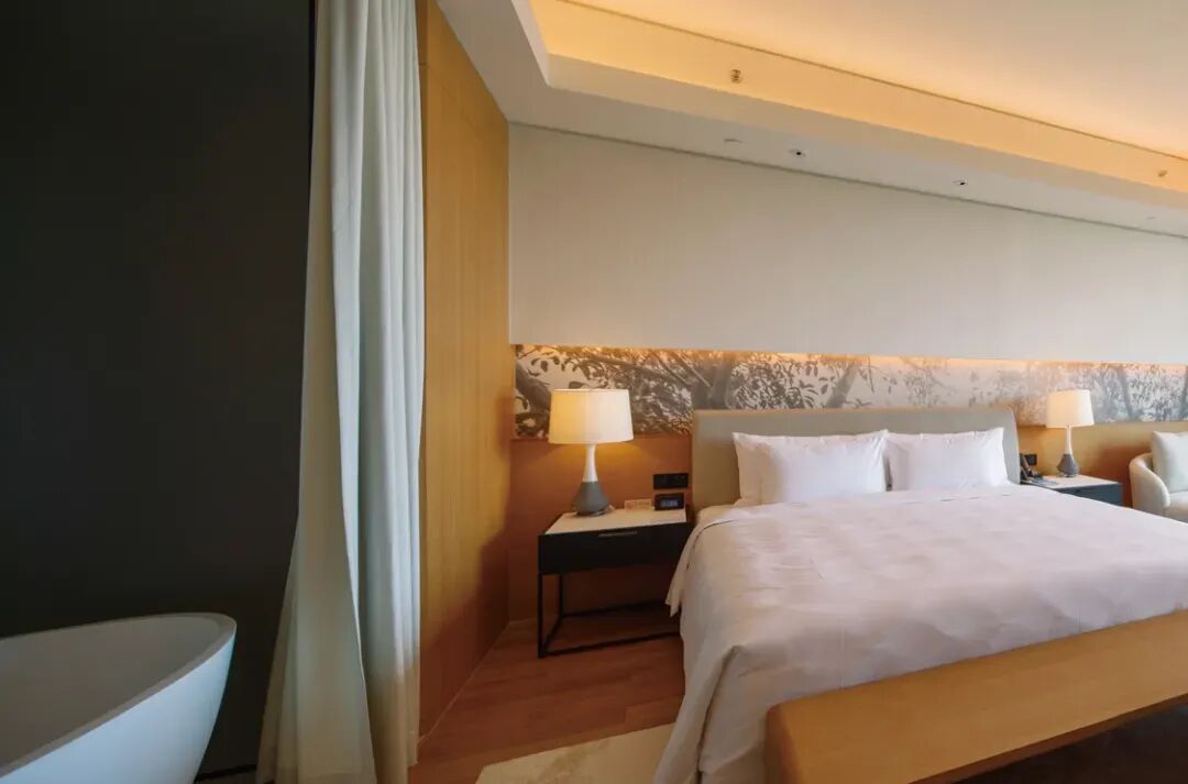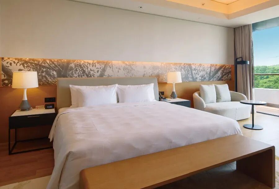 客房採用簡約的北歐設計風格融合嶺南傳統工藝藝術擺設盡顯中西合璧的特色房間內膠囊咖啡機、智能馬桶、光圈化妝鏡等配套齊全,入住體驗温馨宜人