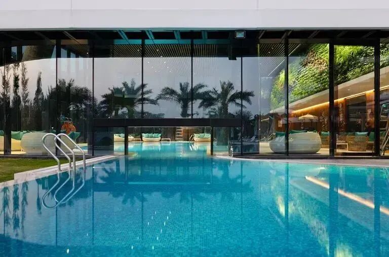 不出酒店嗨玩一整天也不累 【室外無邊泳池】大面積的露天室外無邊際泳池與湖面渾然一體亞熱帶的園林景觀讓你在揮波舒展之時也能暢享大自然的愉悦害怕曬黑的可以選擇室內泳池室內泳池擁有大型落地玻璃窗室內的幽靜氛圍與户外的自然風光交融可與户外露天泳池連接