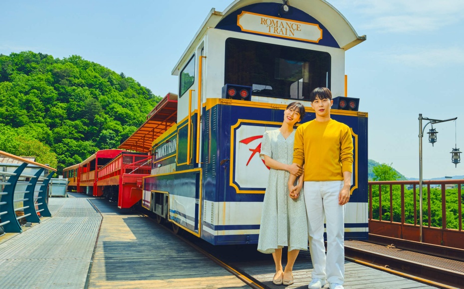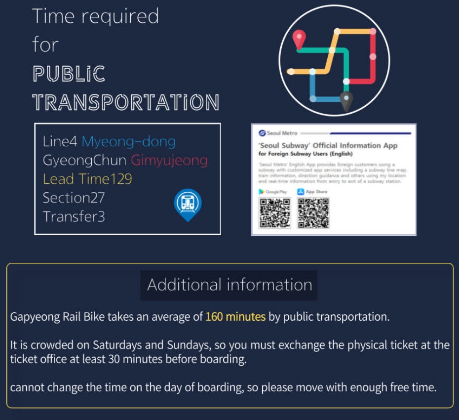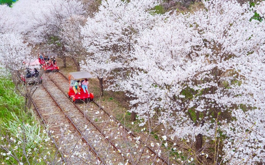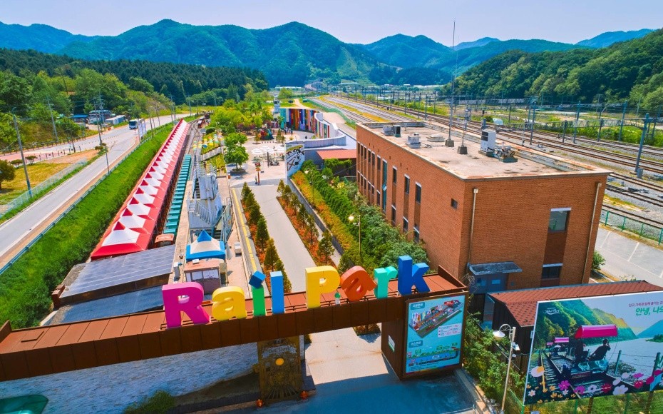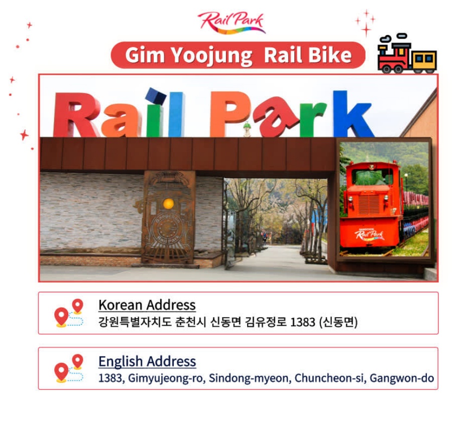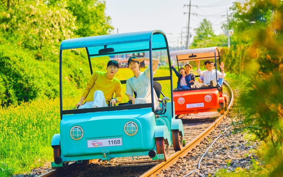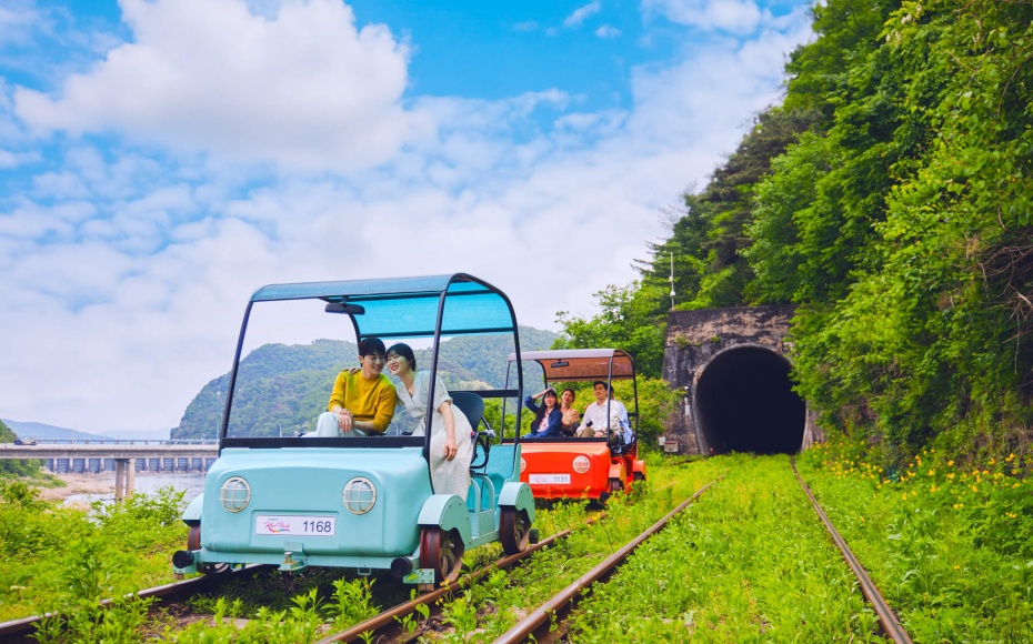 在江村Rail Park騎上鐵道自行車,沿途欣賞江村的自然風景,進入隧道,增添了不少人文色彩。而該地也因「Running Man」節目的播出,成為韓國本地的人氣景點。騎Rail Bike並沒有想象的辛苦,即使不踩自行車也會慢慢走。在上坡路段,綠色傳送帶通過供電的方式,遠離喧囂,伴隨着一路田園風光,讓人十分放鬆心情愉悦。