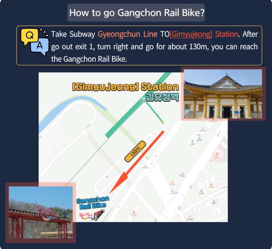 搭乘地鐵京春線至金裕貞站,1號出口右轉步行約130米,抵達江村鐵道單車。