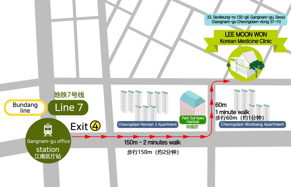 搭乘地鐵 7 號線至江南區廳站 4 號出口,直行 150 公尺後左轉,步行 1 分鐘再右轉即抵達。