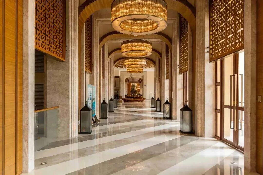 走進酒店大堂,陽光透過鏤空的波浪紋天花板灑下來地板上立馬跳出一片波光粼粼的海浪投影