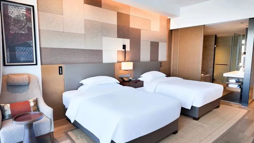 房間把"慵懶美學"玩到極致——原木色傢俱搭配亞麻牀品,躺上去像陷進雲朵裏。房間面積43㎡,有陽台,可看到部分海景,大牀為1.8m,雙牀為1.35m/張。