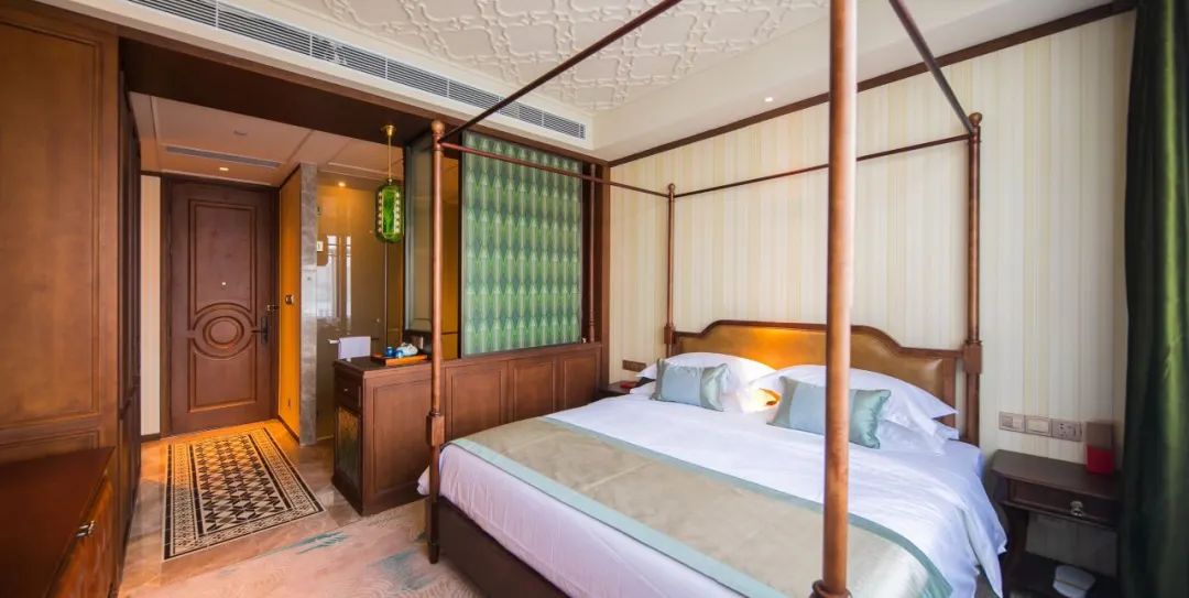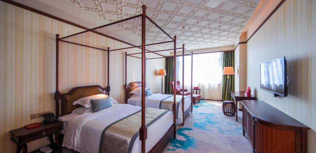 酒店客房設施齊全,牀櫃、窗板裝飾取自江南古典,案几、花格窗民俗風格濃鬱,與景區呼...