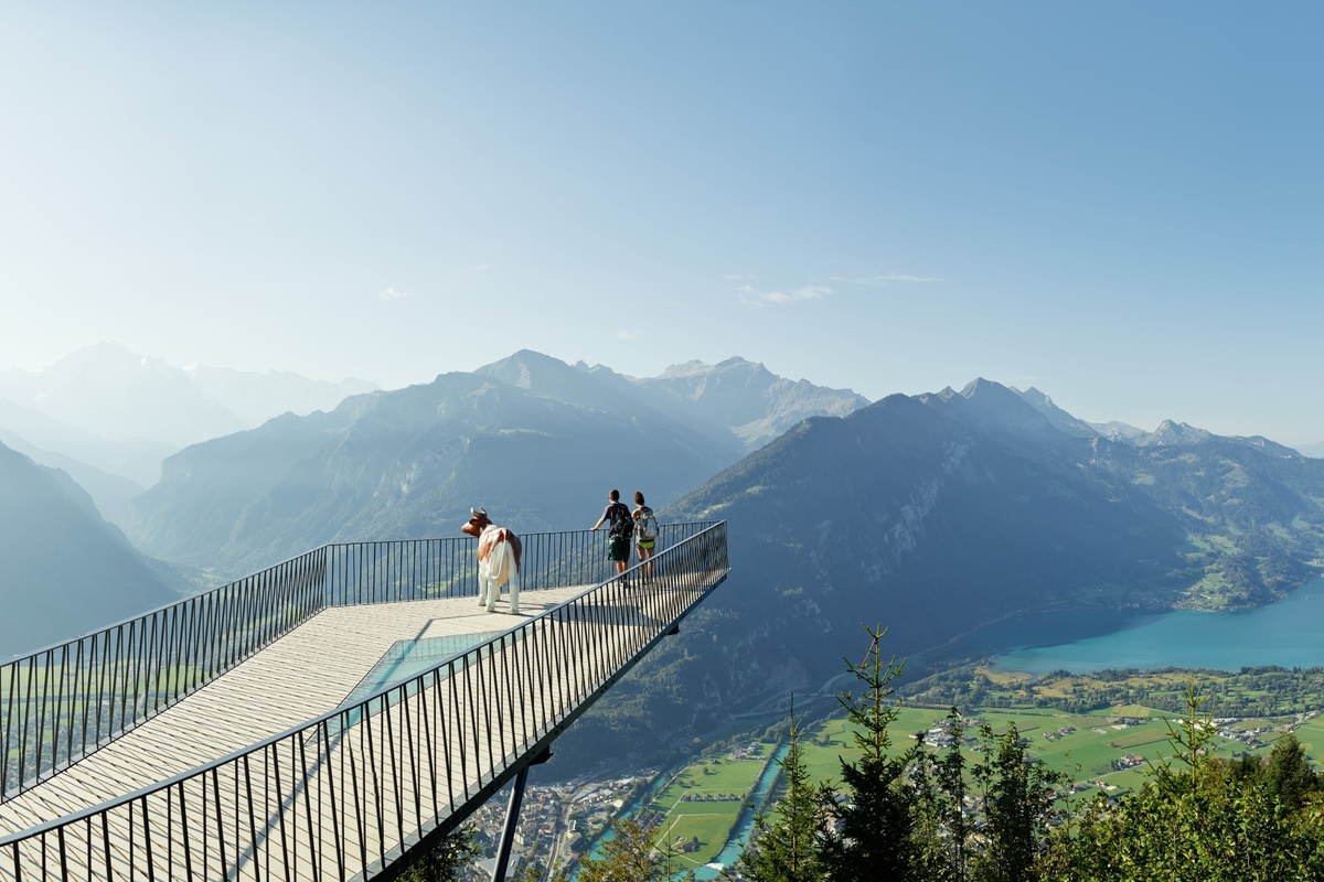 行程亮點首推搭乘纜車登上哈德昆景觀台,作為欣賞因特拉肯全景的最佳地點,登頂後視野瞬間開闊,城鎮、湖泊與遠方群山一覽無遺。站在觀景台上,不僅能將因特拉肯的街道、綠地與建築盡收眼底,更可眺望兩大湖泊的澄澈波光,遠處艾格峰、少女峰等阿爾卑斯山群峰巍峨矗立,白雪覆蓋的山巔在陽光下閃耀,景色壯麗到令人屏息,每一處風景都適合拍照留念。