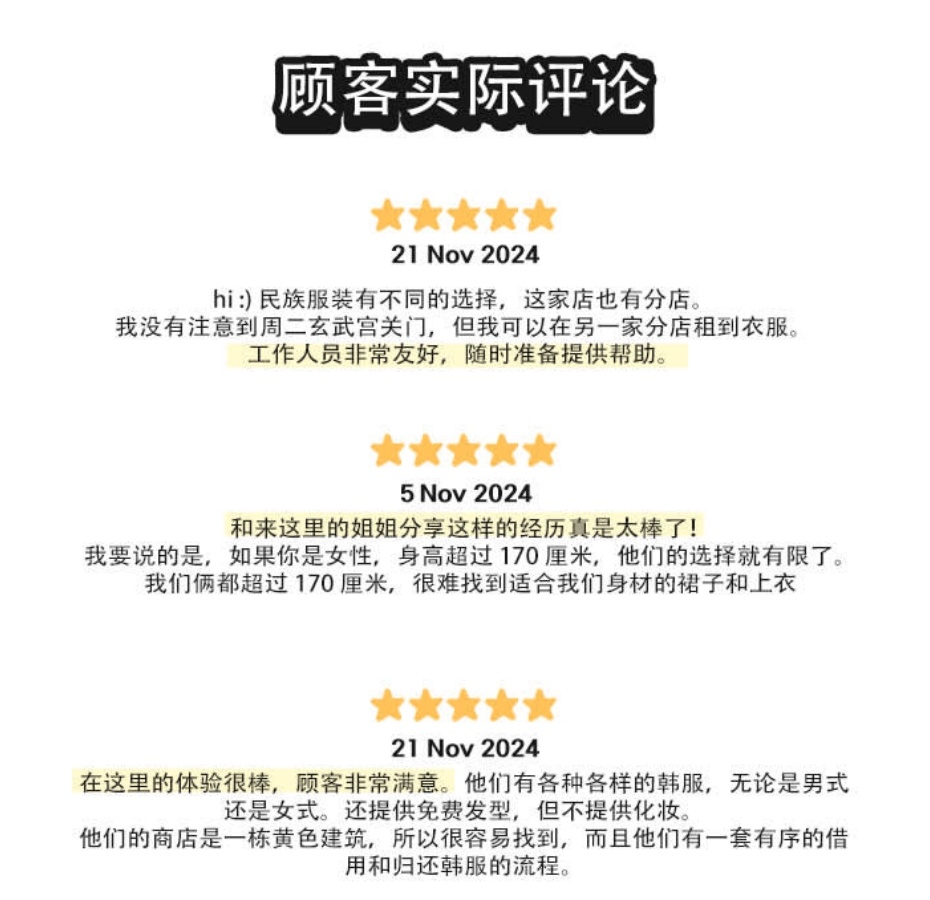延遲歸還酌收附加費:傳統韓服每 10 分鐘每人 1,000 韓元;主題韓服每 10 分鐘每人 2,000 韓元。