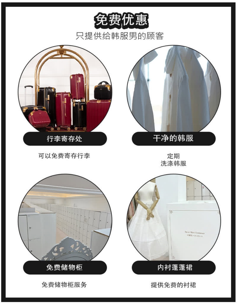行李寄存、置物櫃租借、髮飾(髮箍)、裙撐租借服務等。