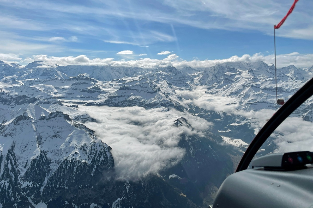 旅程於伯爾尼 - 貝爾普機場正式啟航,這裡是通往阿爾卑斯山巔的便捷起點,專屬座機整備完畢,工作人員會提供細緻的行前說明,讓每位乘客快速熟悉流程,以輕鬆狀態迎接高空冒險。起飛後直升機穩穩攀升,城市與鄉野逐漸縮小,連綿的阿爾卑斯山脈撲面而來,視野瞬間開闊,身心即刻融入壯闊自然之中。