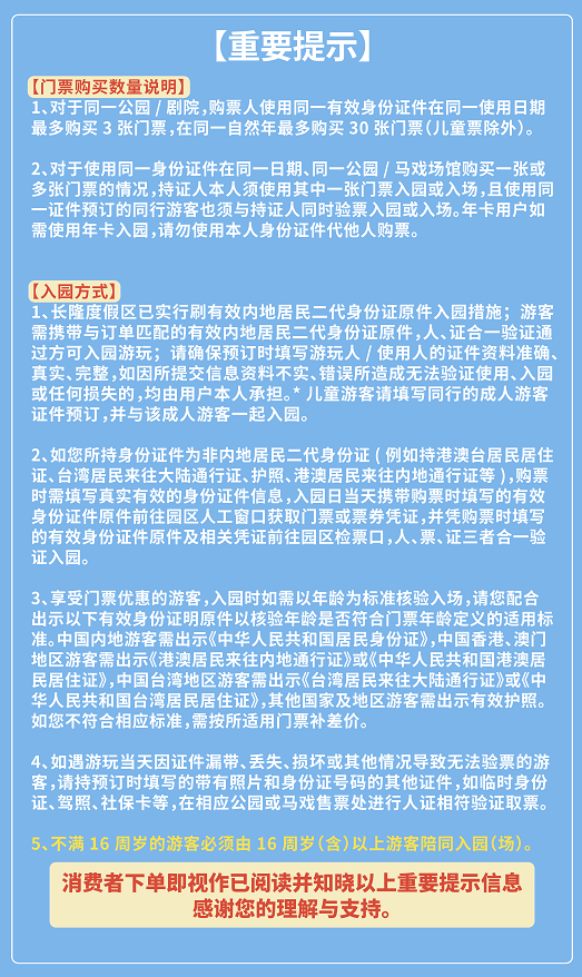 門票價格不包含:園內「漂流河歷險遊玩服務」、貯存服務、尊享導覽服務、行李人工寄存服務、優先參玩權益、嬰兒車與輪椅服務、充電寶、拍攝/拍照、付費化妝服務等增值服務及餐飲、商品等消費;價格以園區現場公告為準,園區內不定期推出優惠政策,詳情請諮詢服務點。