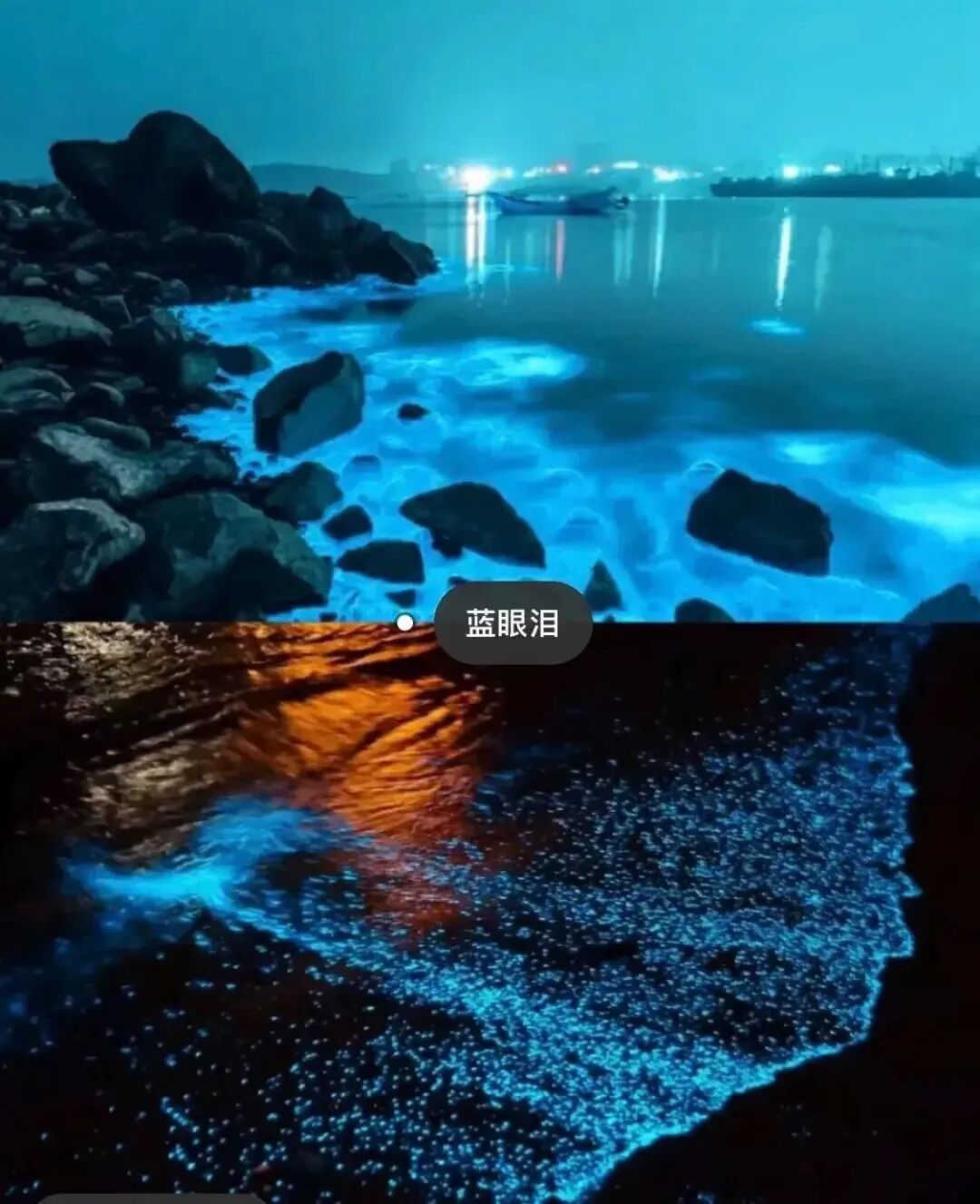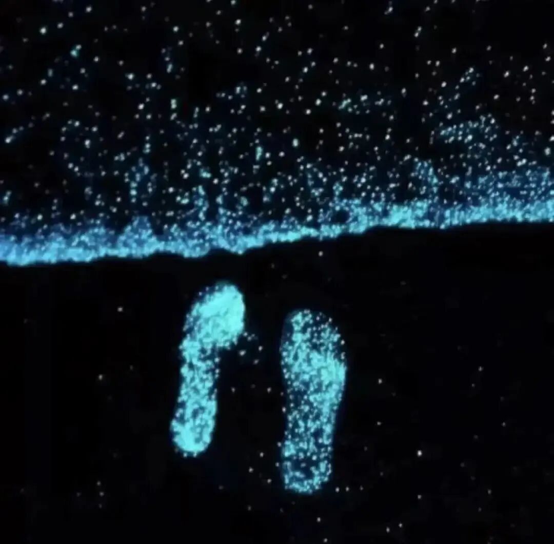藍色的光隨着海浪湧向海灘,長的形成一條線,短的星星點點,隨着海浪湧動,壯觀又浪漫~
